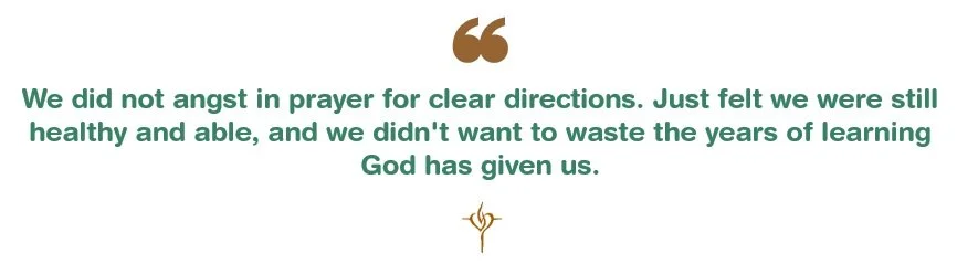 She went on to say, "We did not angst in prayer for clear directions. We felt that we were still healthy and able and didn't want to waste the years of learning God has given us. It was all very logical for us, we didn't want to hibernate in our retirement or reinvent the wheel as time was not on our side now. Once the idea took root we just committed it to prayer and actively researched and spoke to different people involved in missions. We knew God would redirect us if our thoughts were not in line with His."