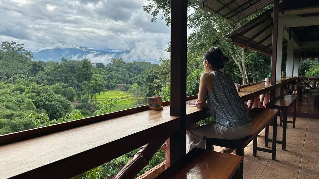 Agnes watching the low clouds weaving poetry in the mountains from the dining hall in September 2023.