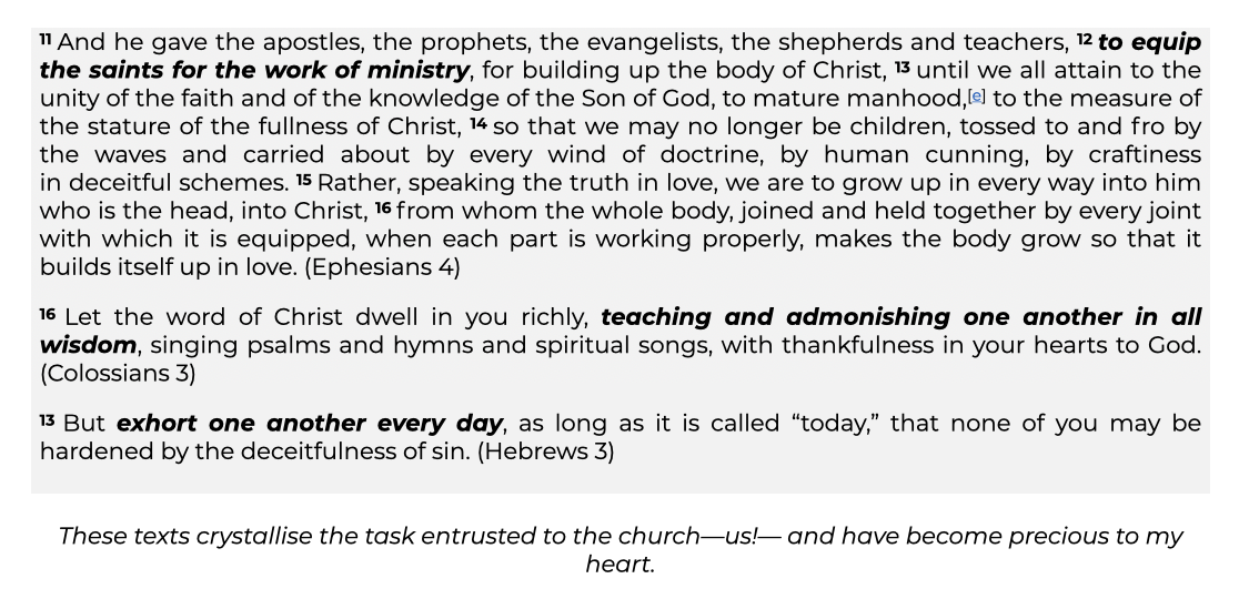 A common thread running through our book discussions was how the ministry of the church falls squarely on the shoulders of the whole church, that is, its members. Church leaders (simply?) equip the saints for the work of ministry. We are not to outsource the work to paid professionals, or expect leaders, structures, or systems to do everything for us. The way Scripture prescribes the growth of the body is through members of the body ministering to one another—one redeemed sinner teaching, admonishing, and exhorting another; all speaking the truth in love to one another. This is how the body grows into the fullness of Christ our head!