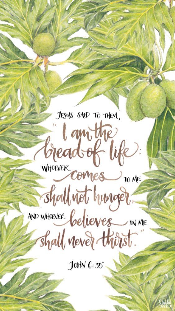 "Jesus is the Bread of Life" features the beautiful Breadfruit (Artocarpus altilis), a tree with distinctive lobed leaves and pointed tips. Its fruit—versatile for roasting, baking, frying, or boiling—offers a taste reminiscent of freshly baked bread or potato when cooked.