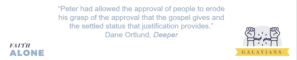 I’m sure we can relate to what Peter must’ve felt in that moment—the need for the approval of others and the fear of losing it. But it was this that caused him to walk out of step with the truth of the gospel, such that Paul opposed him to his face, because he stood condemned. This stands in contrast to Paul who writes in Galatians 1:10, “For am I now seeking the approval of man, or of God? Or am I trying to please man? If I were still trying to please man, I would not be a servant of Christ.” Ortlund helpfully points out what had happened to Peter, and what happens to me: “Peter had allowed the approval of people to erode his grasp of the approval that the gospel gives and the settled status that justification provides.”
