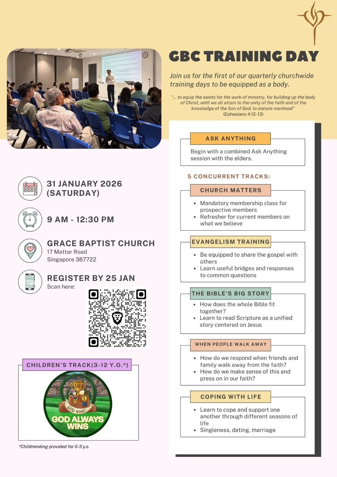 There will also be a concurrent track for our children aged 3 to 12 called “God Always Wins”, and childminding for those aged 0 to 3 years.